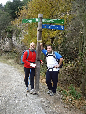 Al coll ens desviem per un corriol ascendent una mica dur però ben senyalitzat que ens porta a un petit coll on es divisa Sant Pau de la Guàrdia. Fem el "segon esmorzar" arrodonit per alguna cosa calenta al restaurant, que aquesta hora està ple de ciclistes, motoristes i "ruteros" d'altres mitjans. Algú aprofita per segellar la credencial amb un segell que l'ocupa quatre caselles.