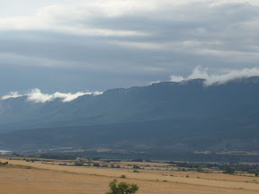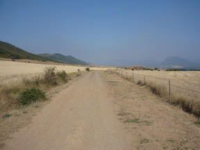 Poco después de Puente la Reina de Jaca cogemos el sendero que nos sube a Arrés donde hacemos una primera parada. Hay albergue, pero no lo podemos ver porque están limpiando. El tramo que nos espera se plantea duro y pesado, ya que son más de 18 kms hasta Artieda sin otros pueblos, a no ser que nos desvíemos a algunos de los pueblos que vigilantes desde la falda del monte controlan el camino y dominan el llano. Enfilamos largas rectas entre cereales ya cosechados y un paisaje bastante seco y erosionado, que contrasta con los bosques de la sierra y el Pirineo que se divisan a izquierda y derecha. Nos encontramos con un peregrino curioso: un italiano que hace el camino a la inversa: salió de Finisterre y su destino es Lourdes. Sobre el paisaje seco que nos rodea comenta: "Esto es como Argelia o Túnez".