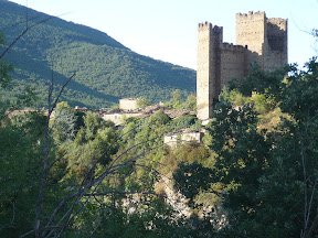 Hacia las cinco salimos cuando el calor es bastante fuerte, aunque la compañía de carrascas y almendros alegra la vista. En el pueblo de Aniés bebemos agua y emprendemos el camino hacia Loarre cuyo castillo se adivina al fondo.